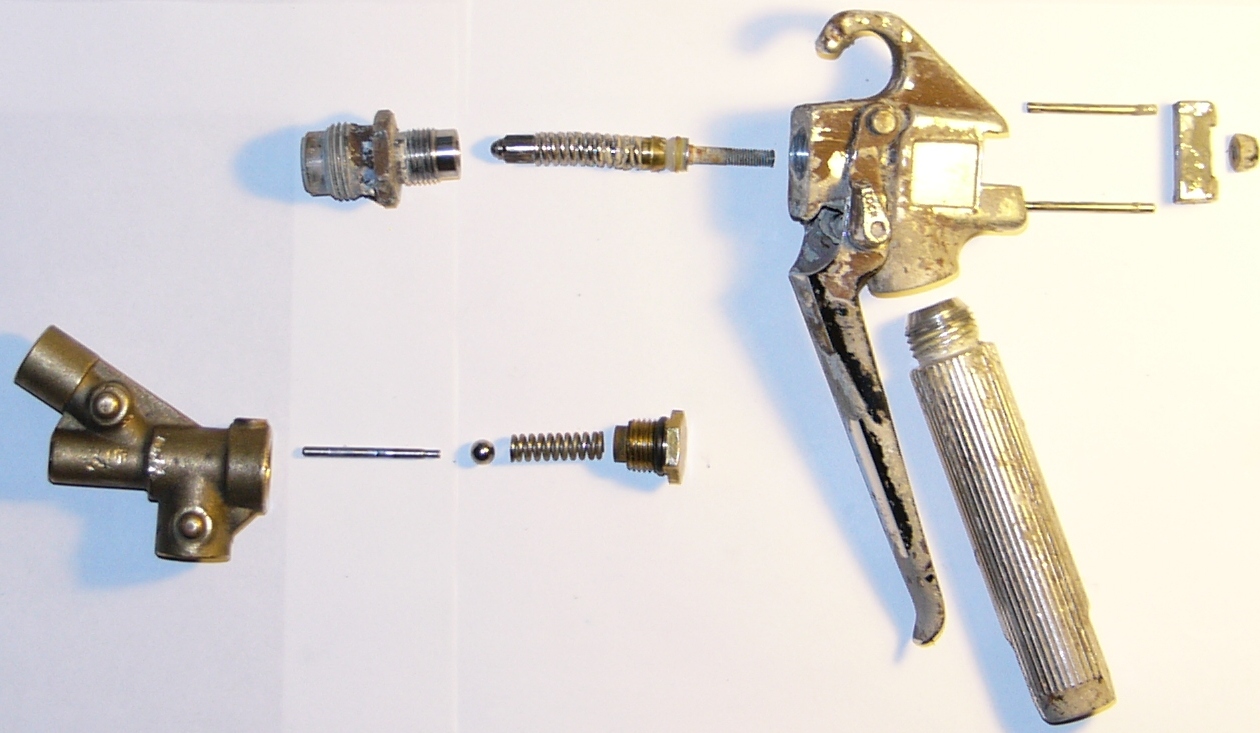 I pulled apart a pressure washer gun for comparison. It appears to have a 1/4" seat (minus the area of the 1/8" pin), whereas the paint gun has a 1/8" seat but full flow. That works out to approximately 1/3 the area.