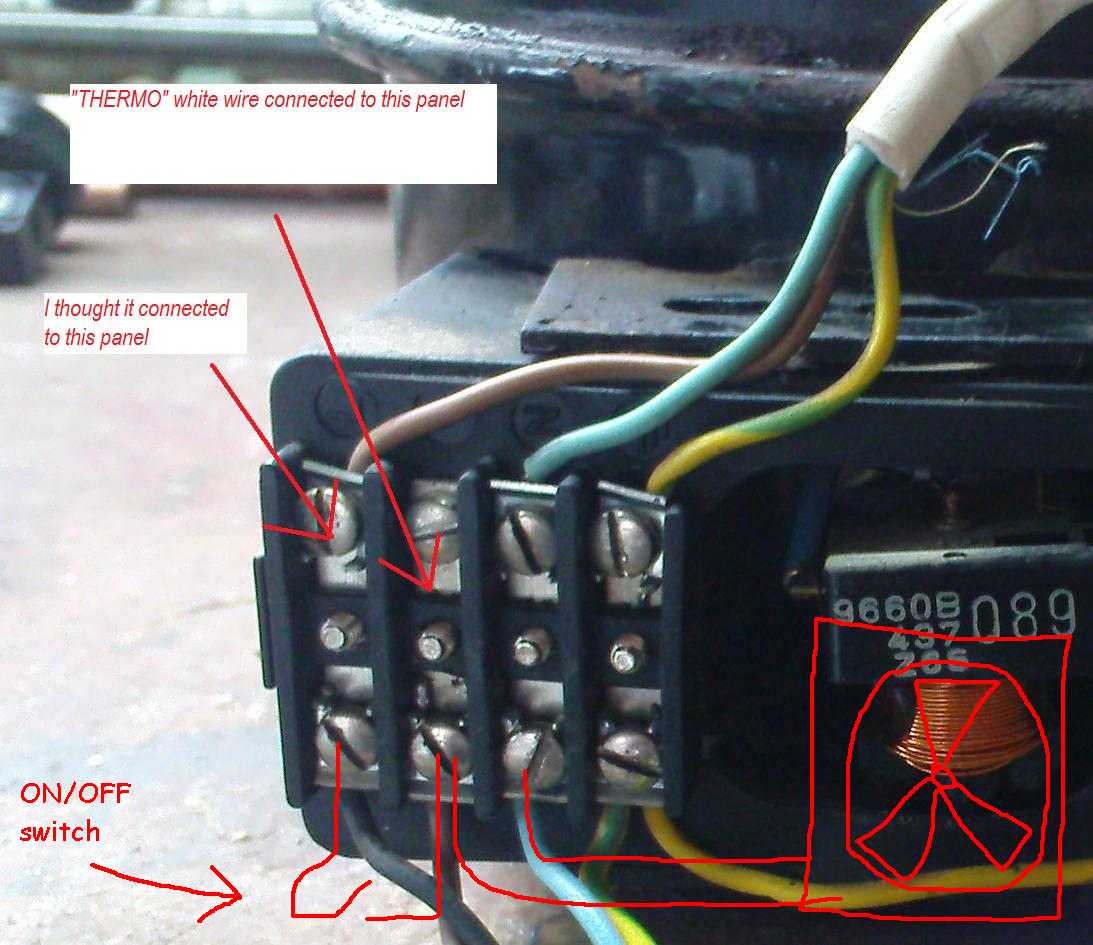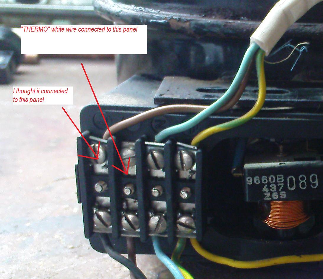 Problem was that I had the UPPER brown wire connected to where it is seen in 0202DSC00411.JPG...which isn't connected to the thermo thingy (note, difference between upper and lower brown wire). In the tight space of the small box I didn't notice that the white wire coming from the thermo thingy was connected to the vacant spot between UPPER wires brown and blue. So all I did was swap the UPPER brown wire to the spot next to the UPPER blue wire (the spot which is vacant in 0202DSC00411.JPG) and it works