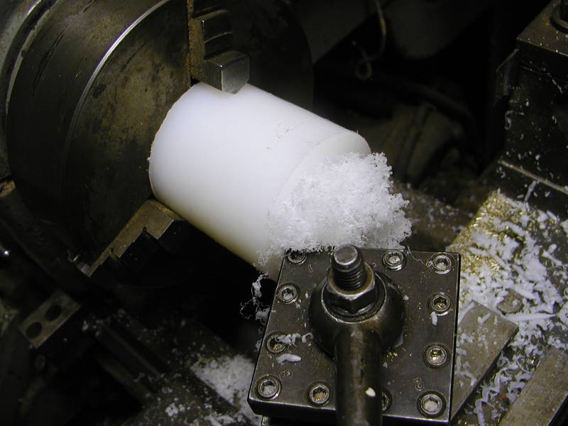 Facing rough cut end of 2-1/2 inch UHMWHDPE stock to show the size of the 3 jaw chuck. This chuck is much smaller than the one at Shureshot. :(