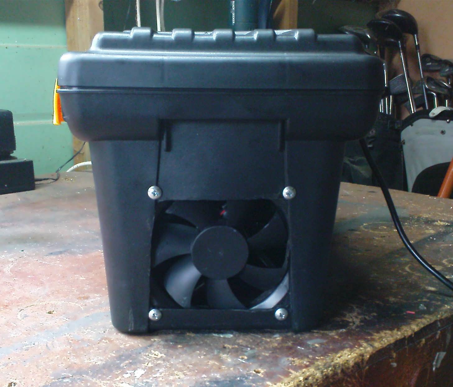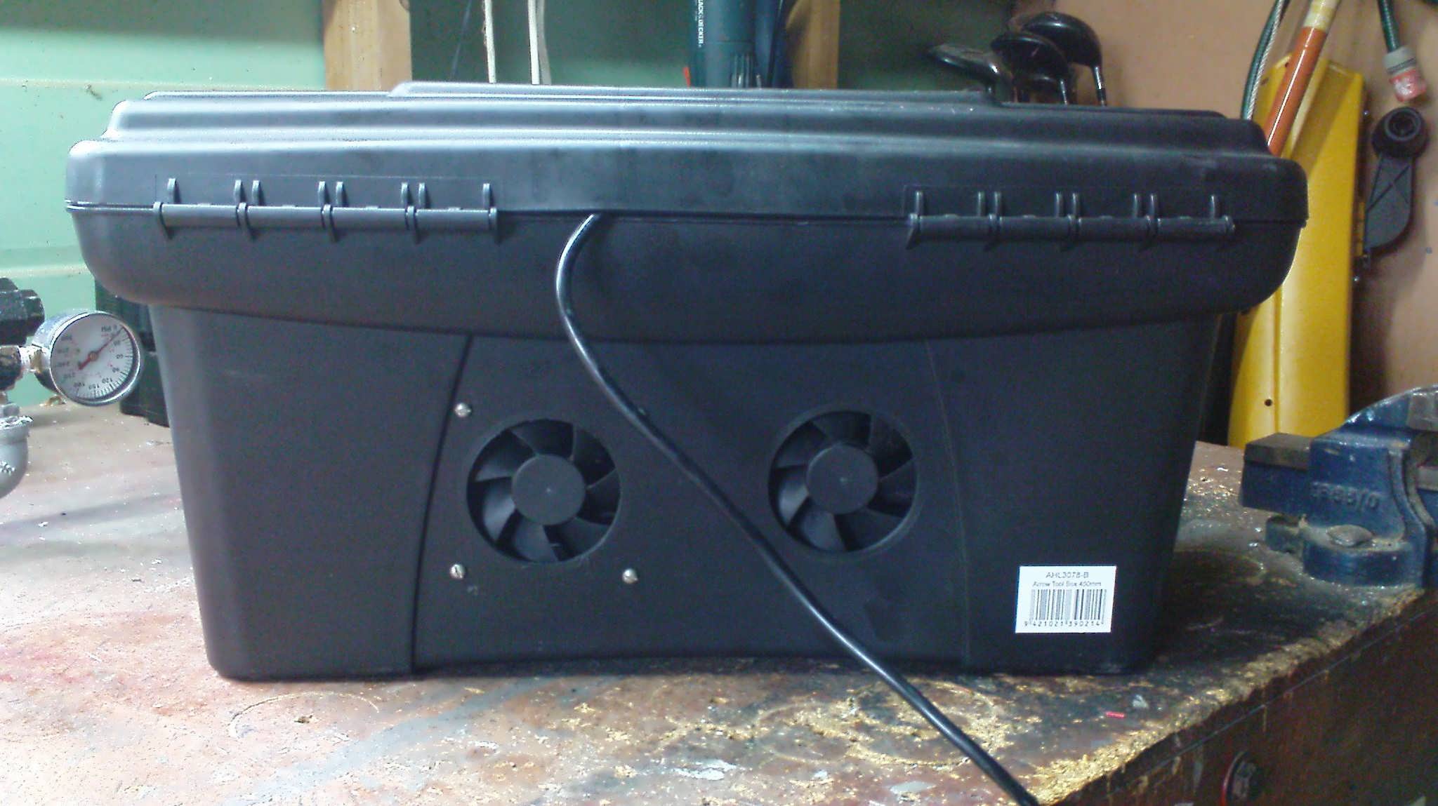 Toolbox was about $12, the 3 fans cost me nothing (2x80mm, 1x120mm) and all the electronic components I had around the garage. All 3 fans are sucking from the outside and blowing in to the toolbox.