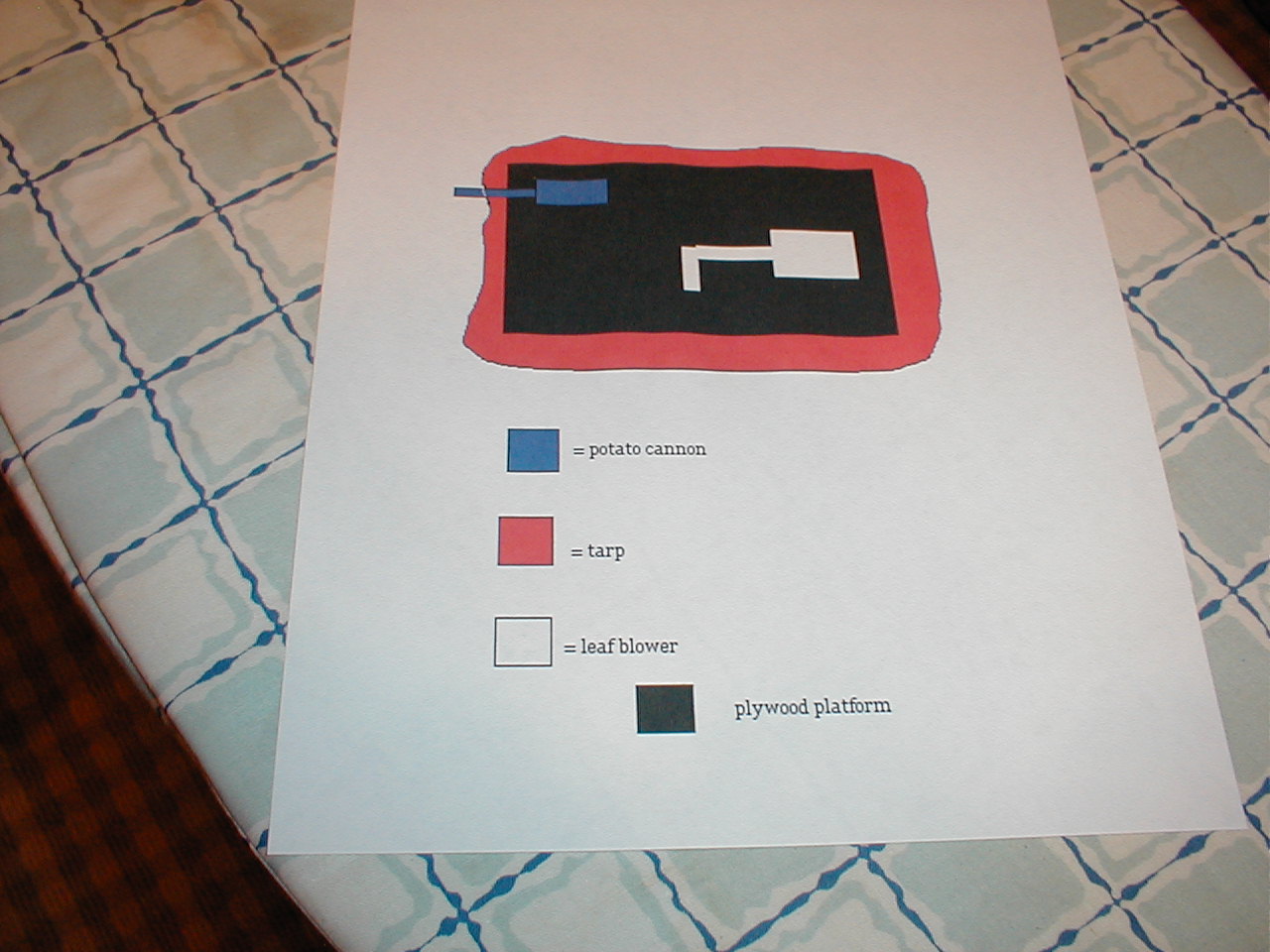 EDIT2: here they are i hope you can read the color key blue stands for a potato cannon. white stands for the leaf blower. black stands for the plywood platform. red stands for the tarp im using for the air trapper.