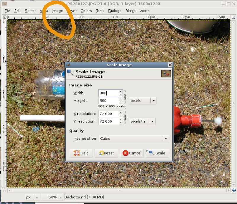 Resizing in The Gimp. Resize is under the Image menu.