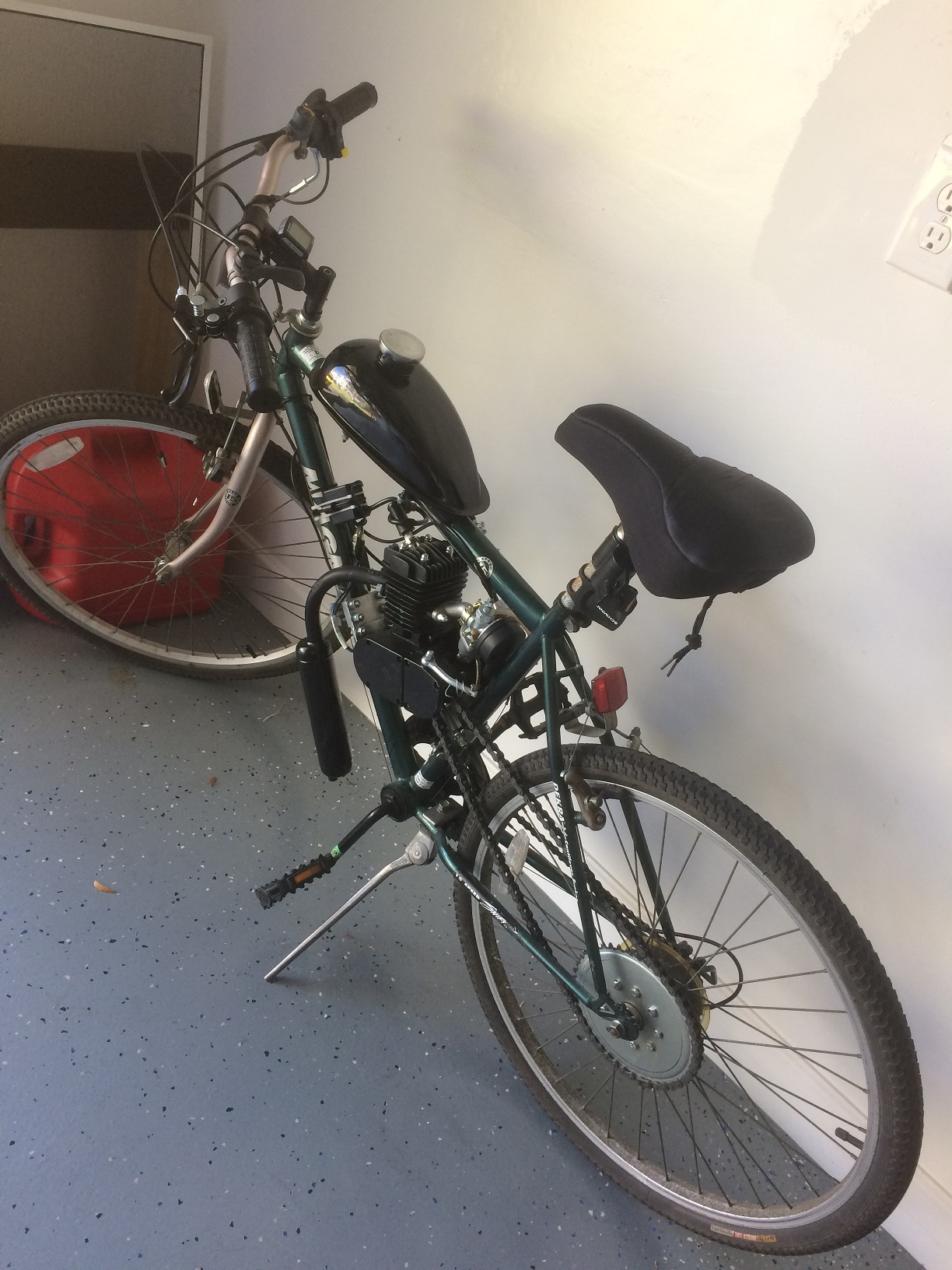 Maxing out at about 30 (that's mph), going to mess with the mixture in the carb and see if I can get her 2 horses revving a little higher. It might not look like much but it's a blast to ride around, and uses barely any gas!