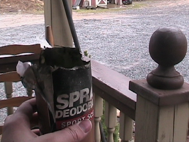 ok well i was bored and decided to make a gunpowder cannon..and since im not discussing solid propellents in a potato gun this is not illegal on this site...so anyway this is basicall an awesome gun...and ill tell u right now with a teaspoon of gun powder this thing shoots a 3/4 ball bearing harder than my first inline did at 125 psi...now i fired this thing twice and it was like 9:30 when i did so i cant take a video or damage picks till mornign but i had cheap deoderent i was trying for my combustion and it didnt work so i shot at it...it blew the top completely off and i couldnt find it..i went out with a flashlite and found the bottom of the bottle 30 yards away..the boom this thing makes is unbeleieveable (sp?) i will have freeze frames and damage pcisk tomorrow...i cant upload vis to my comp for some reason...