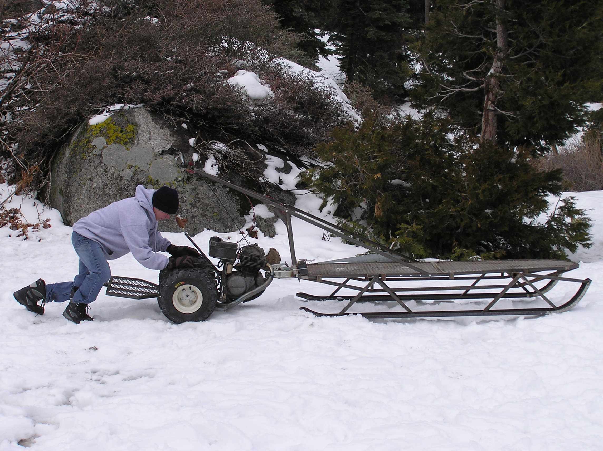 I am in boyscouts and we do an event every year called the Klondyke Dirby. We Hike three miles in the snow to shaver lake's Camp Chawanakee while pushing old outdated wooden sleds loaded with various items that amout to about 600-800LBS per sled (we usually bring Two or three) Anyways I got tired of pushing every yar, so I built a gas powered all steel sled. It has a Kawazaki 200 streetbike engine that I got for 100 bucks, all it needed to run was a spark coil and it started right up. This thing has six gears and the way I have it geared it tops out at about 15 MPH in sixth gear. I built and designed and tested this at my house. It took about 120-130 hours to get to where it is now. Im going to paint it soon.