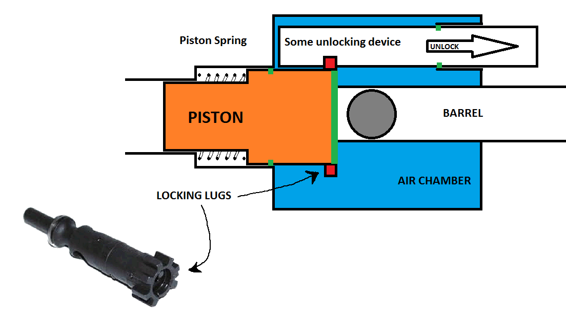 Something for you to notice is also the reduced diameter of the piston relatively to the chamber diameter. A smaller piston face means a smaller force needed to be tolerated by the locking mechanism.