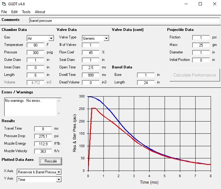 The model suggests that starting with 300 psi and using a fast valve, the pressure in the barrel spikes at 250 psi, the blue line on the graph indicates chamber pressure while the red line indicates barrel pressure.