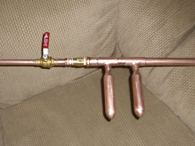 I bought the chambers at Home Depot. They are listed on the shelf as 1/2 inch stub outs but the tag on the part itself states that it is a 6 inch air chamber. They are actually 3/4 inch across the thick part of the chamber.Hotwired wrote:The little copper chambers look interesting, what are they sold as?