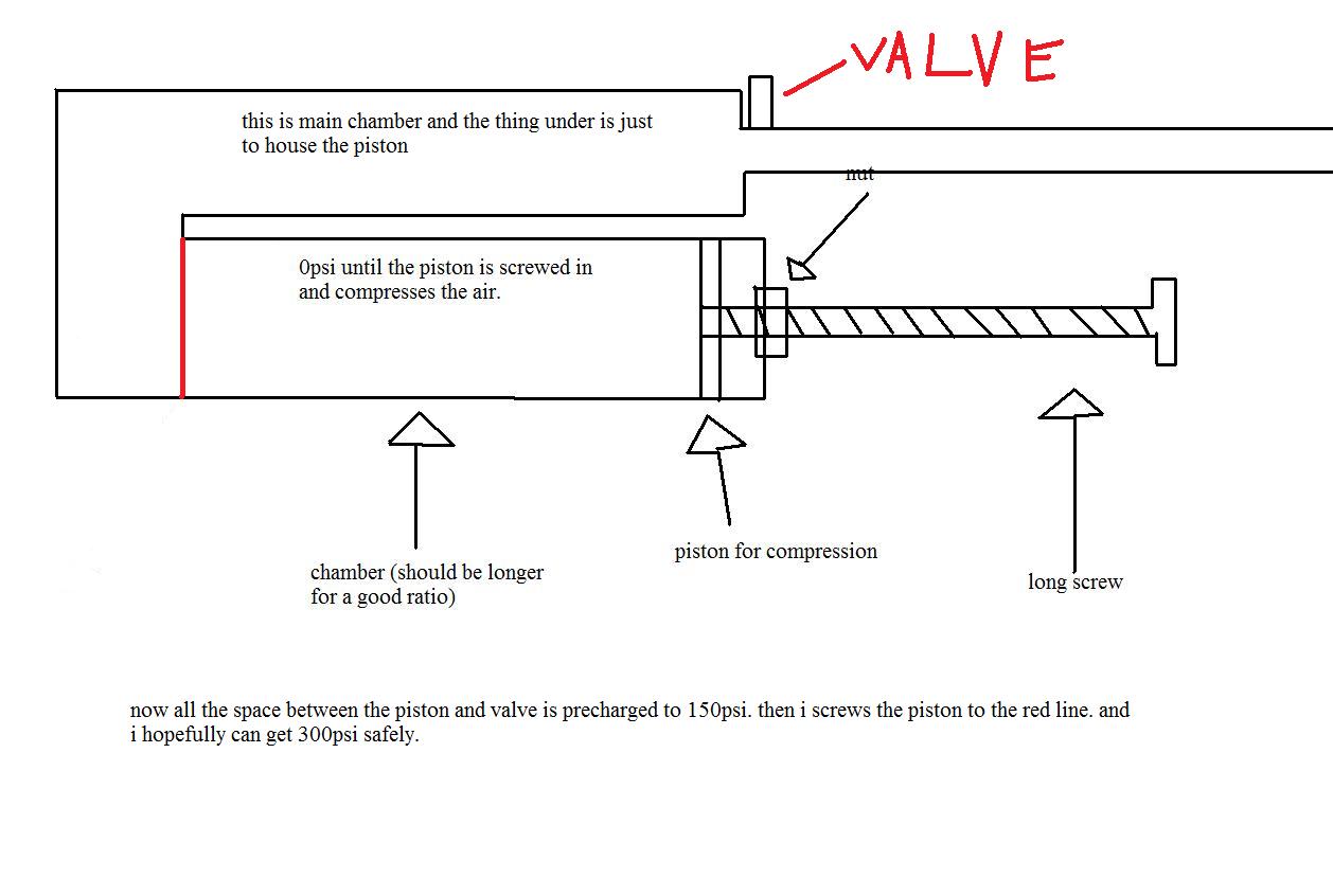 well you wouldn't go that far to 600 psi you wouldn't be able to push the gun down with that pressure well I wouldn't but you could probably get to 300 maybe the piston foot strrips and the catch mechanism on a long threaded rod so the catch mechanism could be adjustable.