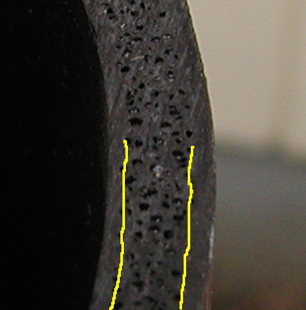 Low density PE ( irrigation pipe ) looks a lot like the blown up sample photo. It is much thinner. I am still guessing the light interior color is the result of a propellent not permitted here. Looks like powder burns and residue.