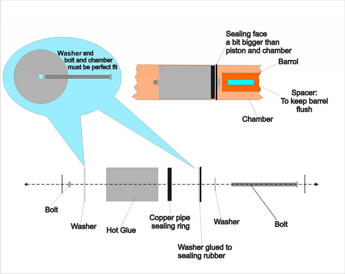 My wooden piston has a steel backing washer inbetween the piston and 1/8th thick rubber sealing washer, then another steel washer on top the rubber sealing washer slightly smaller the the barrel inside diameter leaving only a slightly larger sealing face then the wall thickness of my barrel.