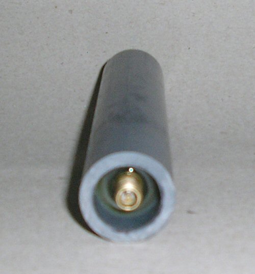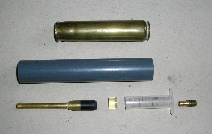 - Basic components - the "barrel" (actually an air duct) with rubber tubing added epoxied in place (with the epoxy smoothed down to streamlined shape in my "lathe" - a drill clamped in a vice :D ), the epoxy piston (now sanded down to give a smooth face), syringe tubing (which still has to be cut down) and cut down schrader valve. Next to the PVC body is a genuine WW2 20mm cartridge for scale, the actual caliber of the launcher will be 19mm