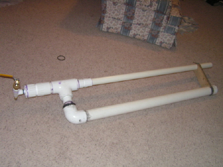 Ok, so here it is. It has a 4'10"x3" chamber and a 4'10"x2" barrel. The valve is a 2" porting barrel sealing piston. It has 2 o-rings to increase performance. The sealing face is 2 layers of truck tire tubes held on by a nice big washer and screw. It seals against a 2" coupler cut in half and the stop sanded out(so it would have a nice square sealing face). It's piloted by a 1" ball valve and has a quick connect and 1/4" ball vavle for filling.