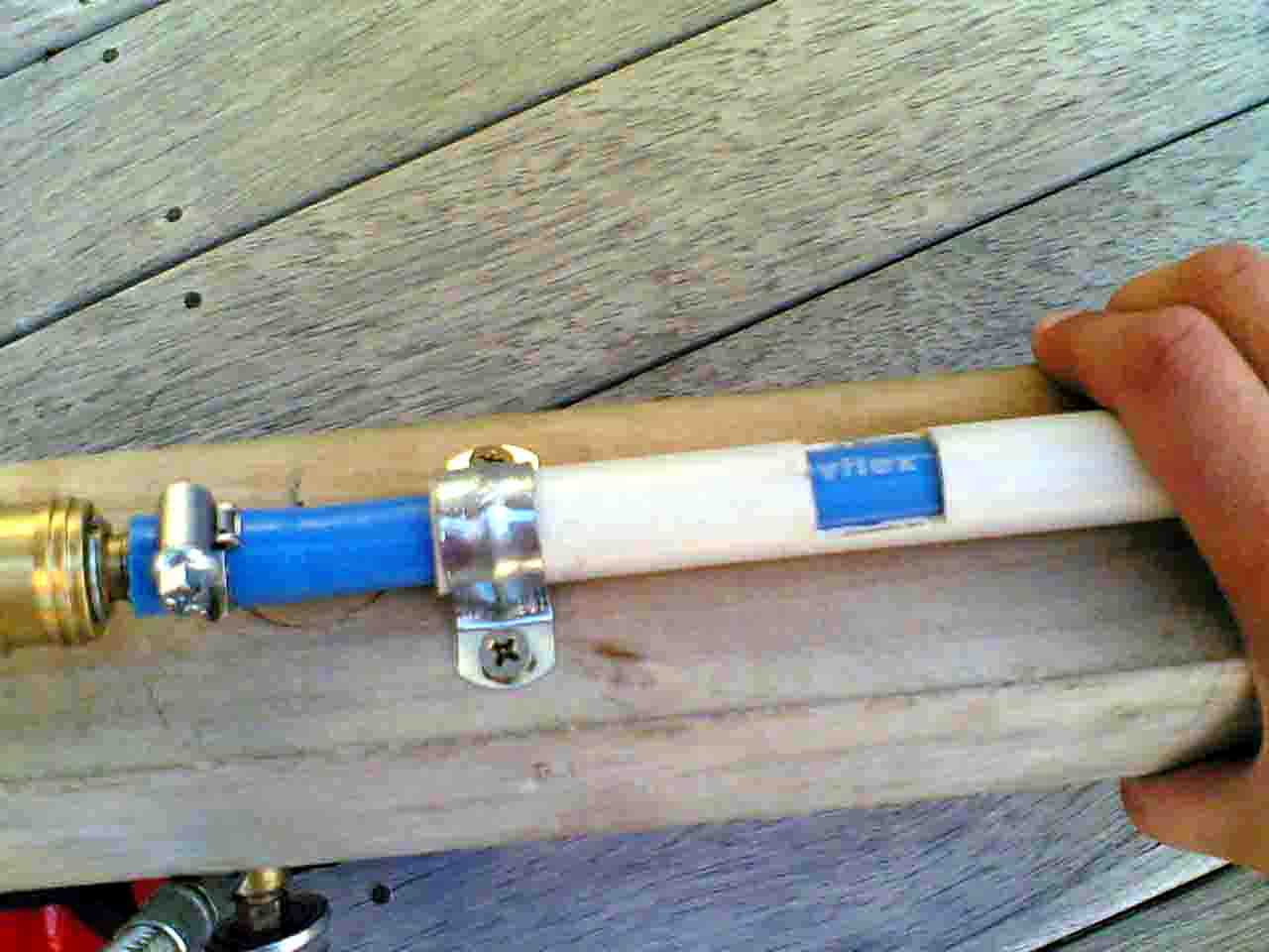 Since I didn't have the right tools to weld I decided to leave the valve on the fire extinguisher and use the gauge built into it. The flexible hose you see attached to the extinguisher is a... well I don't know what it is but I forced it into the extinguisher, no leaks even without plumbers tape. The barrel is electrical pipe, its not pressure rated but I have done tests on it to 150psi and it still holds strong.