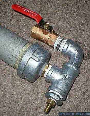 - This is the first design that actually worked. It has a male adapter JB Welded into the end cap with a tee on that. The tee leads out on one side to a sprinkler valve and on the other side to a Schrader valve. This design worked but still constricted the airflow a little. Below is a close-up of the rear of the gun.