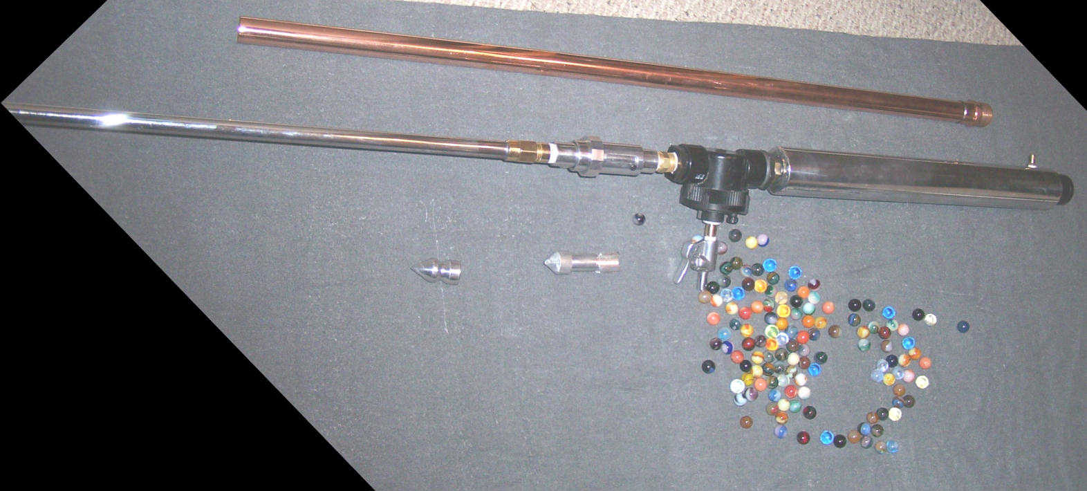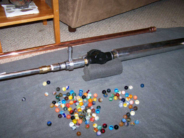 Well this is my polished aluminum breech loading marble gun.It also sports a muzzle loaded one inch copper barrel.All of the machine work was done by me.I built the tank out of 2"schedule 80 pipe with tig welded end caps.It has a toro 1"modded sprinkler valve .I also built the Trigger on the blow nozzle the stock one was tin so I machined this one out of aluminum.The barrel is polished conduit Pressed into that custom bored brass fitting and soldered.The breech was built on the lathe and has oring seals.It also has a o-ring groove on the inside to keep the marble from rolling out.I also built the one inch pellet and the one inch rocket on the lathe.It fires very well I rest the tank on my shoulder and site down the barrel.Well I hope you Like it.I have a twenty foot stick of sdr21 coming for a golf ball barrel But it didnt make it before the contest.