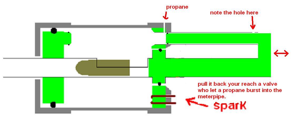 The piston contains a check valve to release gas both during the backward pump stroke and during firing, yet remains closed to prevent diffusion of propane while the gun isn't being used. This check valve is actually a safety pop-off valve with an extremely light spring. It's mounted inline with the barrel and offers very high flow during combustion.