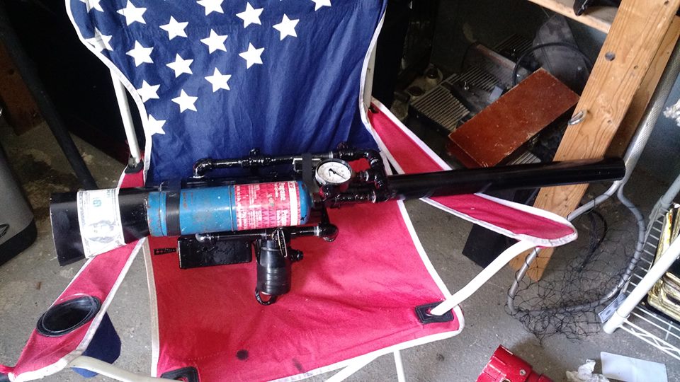 ok so its a 3 inch chamber witha 3 1/2 inch barrel 3/8 pipe on the metering valve and the same on this air relif thing that dosnt work so well but i may turn into a nitrous oxide manifold . the stock i got from another project i recently did here i cut the stock off a shotgun.electric bbq ignightor and pistil grip also 2 smaller fans inside. i shot it today and was very impressed the metering pipe is a little to long so i might have to change it but i think it might just work better in the cold.