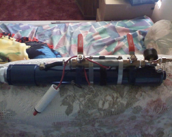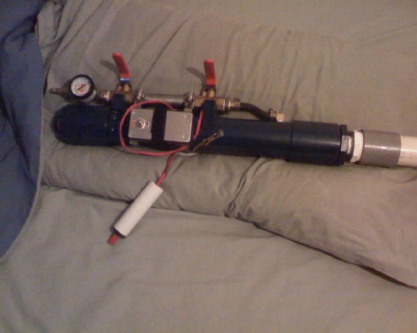I have a combustion which uses metered propane, BBQ sparker ignition with a single spark gap, and a 50mm chamber fan. The gun's chamber is made of a 17.5" long section of 2" SHC40. It uses a 2"x¾" reducer bushing with a ¾" end cap, and a 2"x½" reducer bushing for the barrel union. I have a ¾" barrel for shooting batteries and stuff, and a 1½" barrel for golf balls, persimmon's, spuds, etc. The 1½" barrel is 35" long and the ¾" barrel is 48" long.