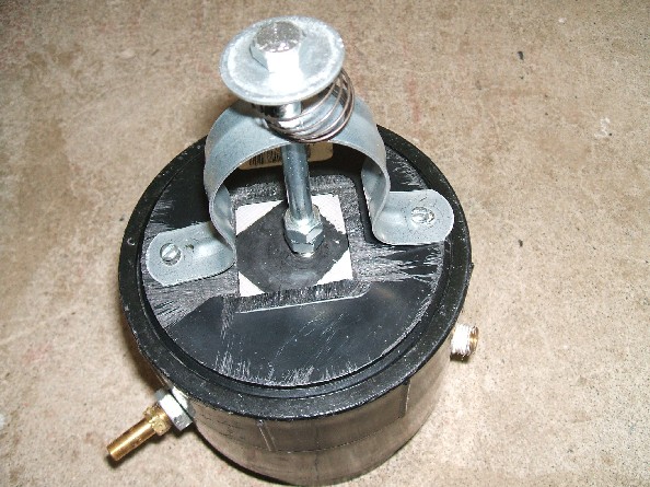 The venting system is the coolest part. Using Gort's idea (which I had also thought of a really frickin' long time ago) and spendin $1.50 seemed quite a bit better than blowing almost $30 on a 2" PVC ball valve. This system is spring loaded, a small modification of Gort's. You press it down, hold it for a few seconds with the fan running, and let go, and it pops into place and seals.