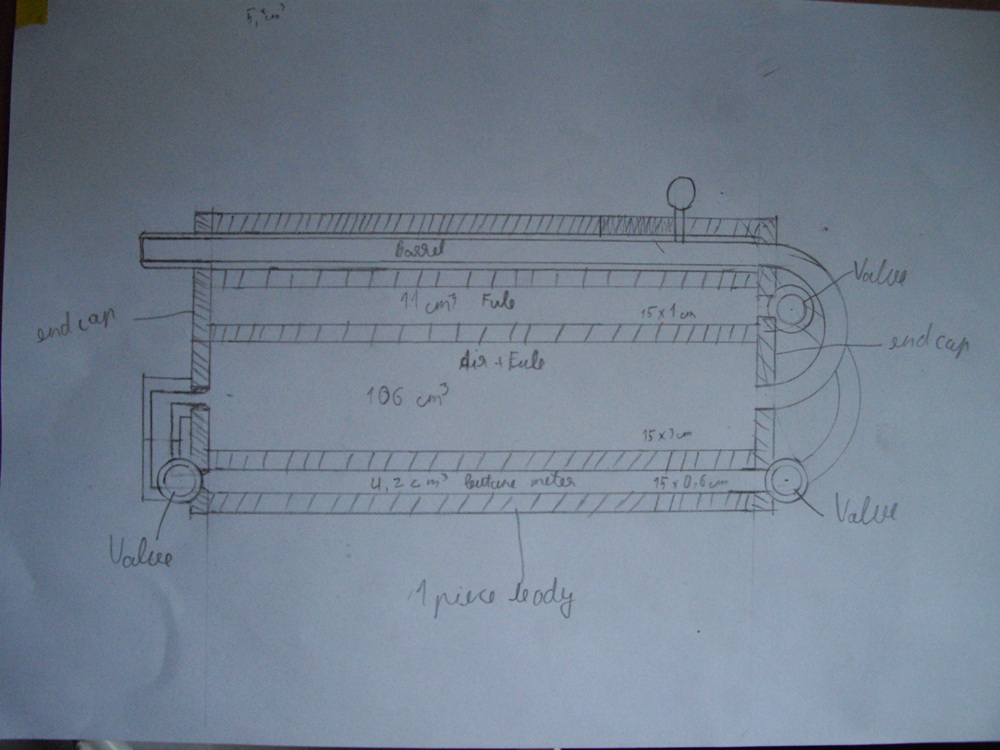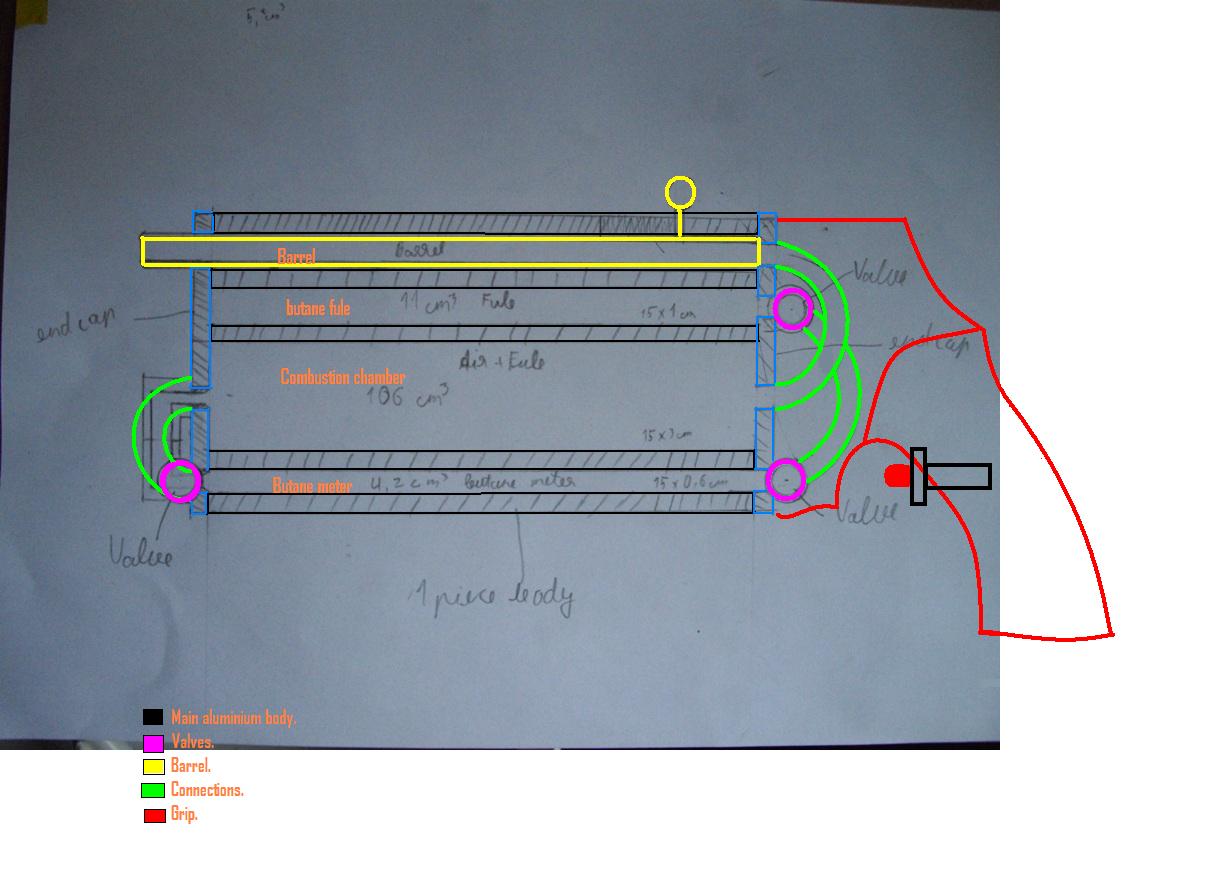 I got a idea to make a aluminium gun powered by butane. The main chambers would be made out of 1 piece of aluminium with copper fittings. The ignition would be a BBQ sparker. My grandfather is a retired machinist, so he could help my with the aluminium body and other stuff. I have a huge piece of aluminium, 4cm thick, 15cm wide and 10cm long. I also have a piece of 5mm thick aluminium witch is 30x30cm big. I have 100$ to spend. I am a hobby woodworker so I could make cool laminated grips for it. :roll:
