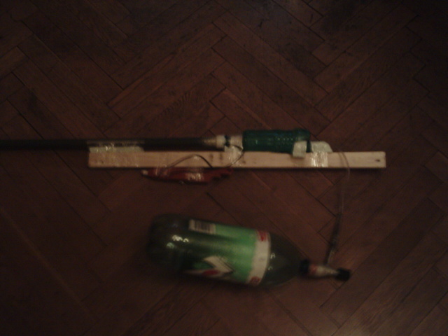 This is my new hybrid sniper.It works on the principle of my coke bottle hybrid.As I said for my pistol it has a great recoil.The time from the boom of the gun to the moment of impact when shooting a battery is vrey little comperad to my other guns=>so it is quite powerfull.It is very noisy.I like the sound of the chamber when filling with air 2 seconds befoure the boom.