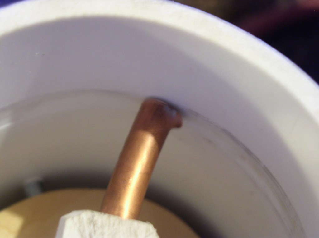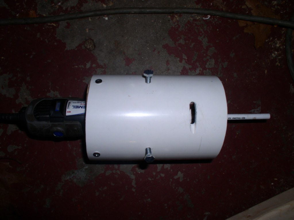After seeing the Mythbuster's confederate steam machine gun I considered the idea for a airsoft gun using the same principal. First of all I have condemned this idea temporarily because it is horribly inefficient and would chew through a battery pack pretty quick. It's powered by a Dremel rotary tool that has a max no load speed of 35,000 rpm, but the gun starts to destroy itself when pushed beyond 2/3 throttle. The barrel is made of copper tubing sleeved over a bic pen body. The drive block is made of Azec PVC outdoor molding (it's like a really dense PVC foam). Those four bolts push on a collar the goes around the neck of the Dremel to center it and stop the barrel from rubbing on the guard. One problem is that BBs hit the exit slot and destroy the end of the barrel but for some reason the gun never stops running even when they get jammed. All in all is has lots of flaws but it's current state is what it will stay for some time.
