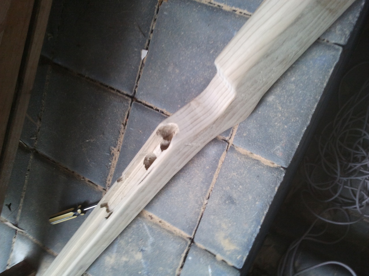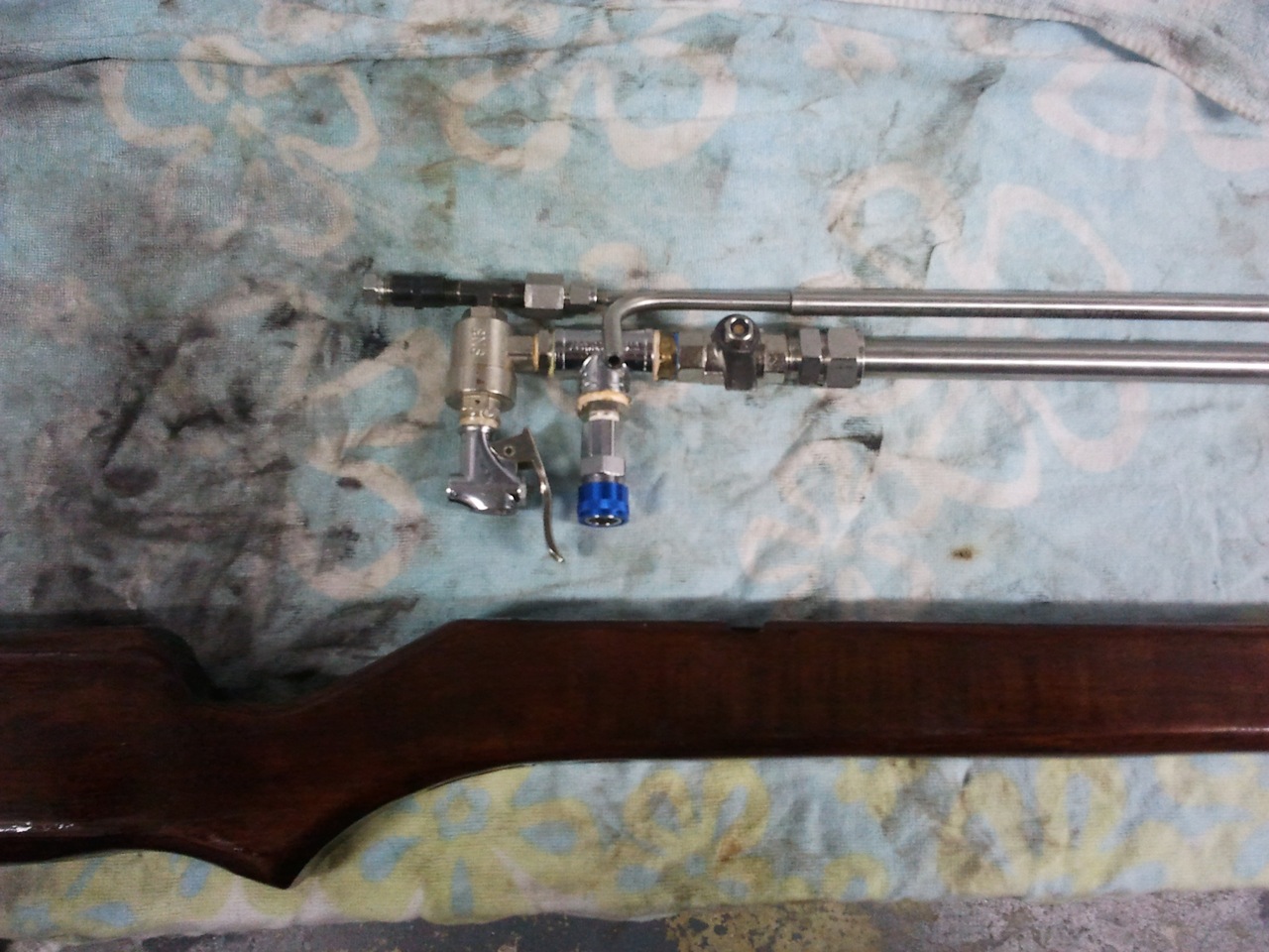 the stock was cut from a single piece of wood, then the relief for the air tank and trigger etc. were cut into it. it was sanded and painted with 2 coats of rich jarrah gloss varnish. (the stock from start to finish took 2 days.)