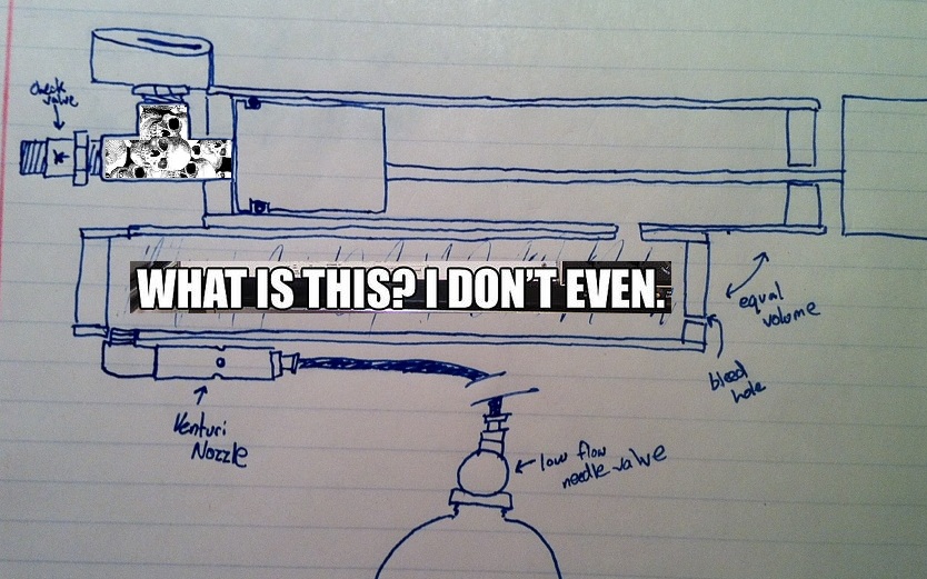 This is not the most efficient means of fuelling, because you lose some that is not captured by the pump. But it is a very simple way to achieve a range of high mixes, which as JSR said is determined by the pressure you pump it to, with no measuring required. In the end because of my ghetto fab job, it proved unreliable, but I have no doubt that it could be made reliable with better construction techniques. However, I found a few drops of starter fluid on a schrader followed by straight air from the shock pump ended up being even simpler with less misfires due to the wide air/fuel combustion range of ether in the starter fluid. I probably won't revisit it as I've moved on to real firearms, but someone should try to combine the two ideas - taking out the step of manually dropping the fluid in.