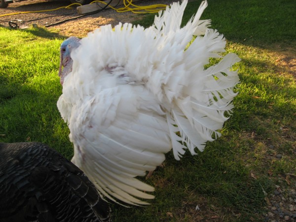 a friendly tom turkey, who is all white. Friendly bird, came right up to me looking for handouts.
