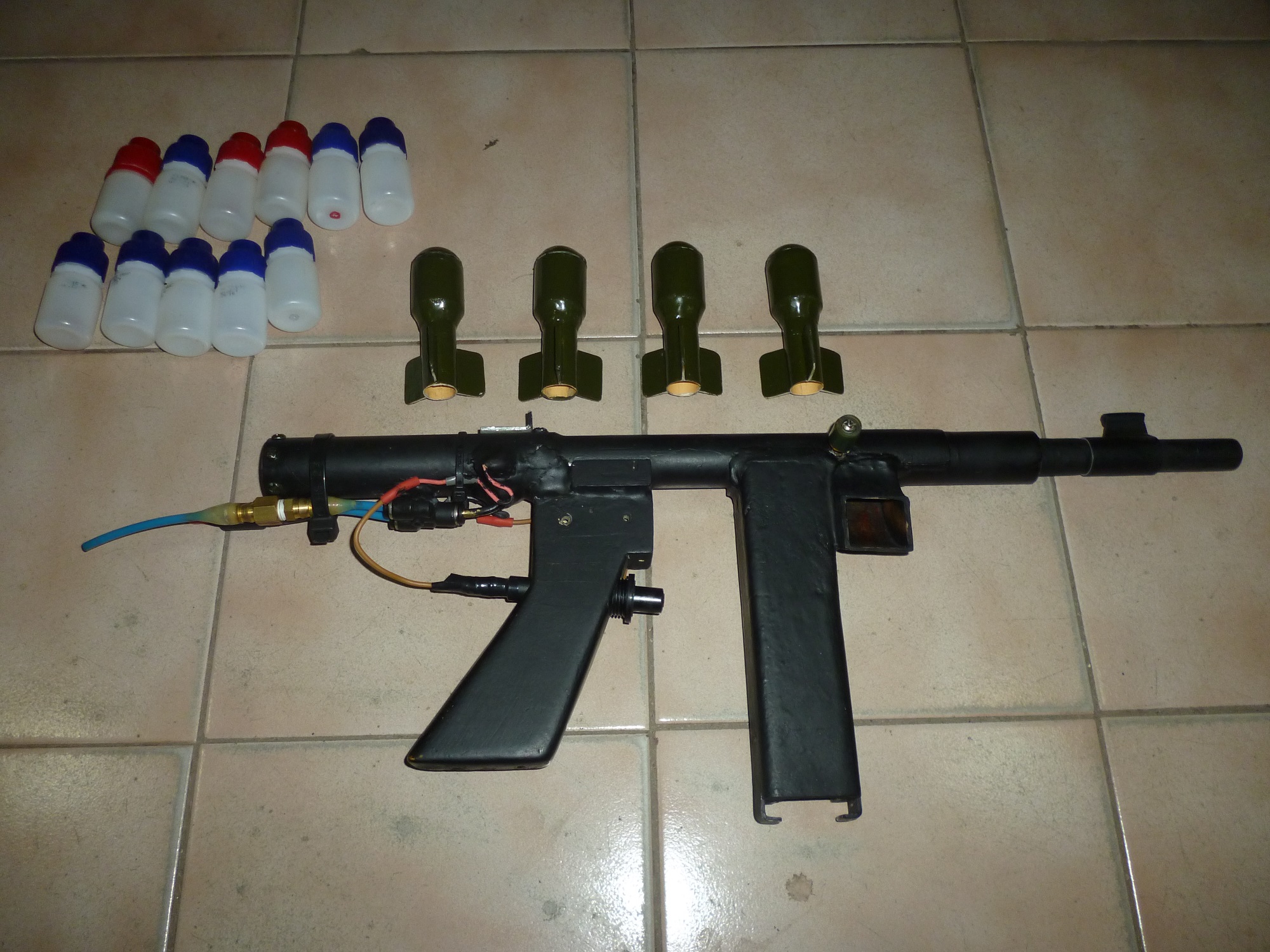I have a kind of "grenade launcher" that works with a rupture disc, but it is not exactly like the drawing. The projectile is simply housed in the firing barrel. It is an ancient weapon that I built, that I adapted for this purpose. The "cartridge" that houses the o'ring and the rupture disk has no ammunition, and I only use the gases generated at 8X, to propel the self-built projectile, which is hollow. I increased the amount of air, because you need more air to decently throw the projectile. It is a plastic container, about 15 ml, with three fins and a hard aluminum tip. It weighs about 10 grams. I have tried to increase the weight by adding a little lead to the nose, but it seems to be a lot for the little base, and sometimes it inflates it. Besides, the roar is deafening and the ammo is damaged when it hits any target. I have left it at 10 grams and I shoot it against a thick fabric where it does not get damaged. One of the most fun weapons to shoot. I'll add some photos this afternoon.