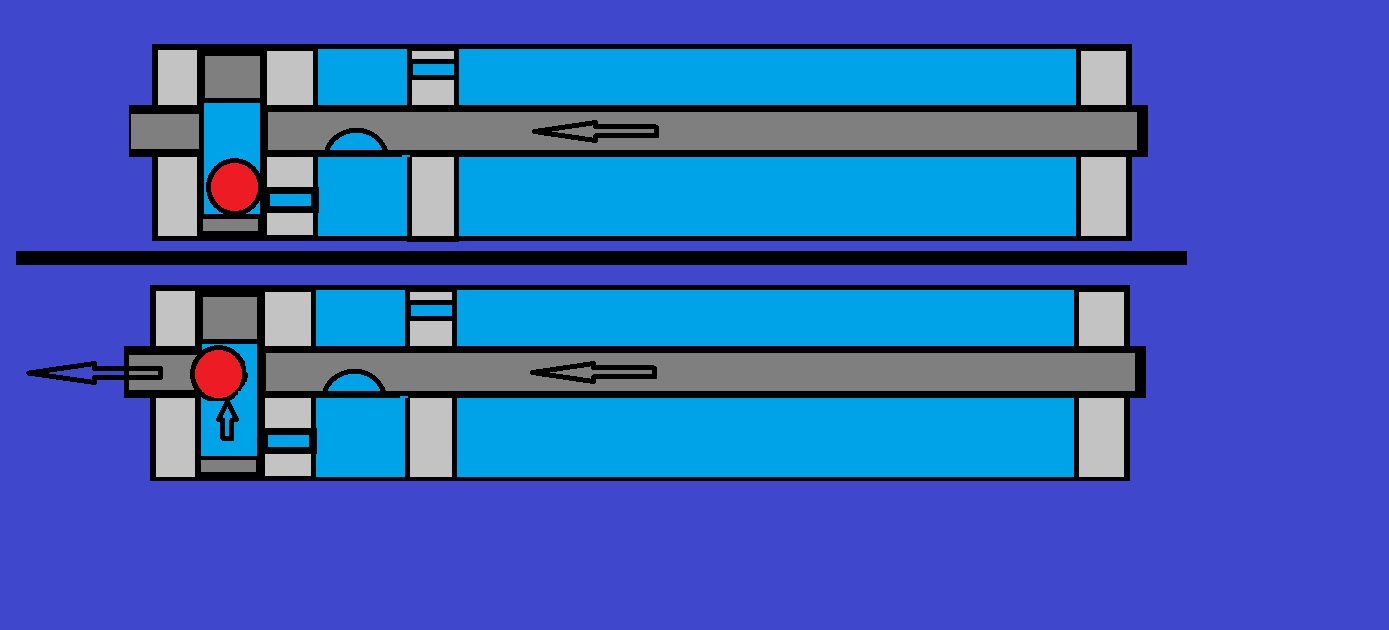 I just realised I forgot to draw the porting in the barrel but you should get the idea, the gas flows into the chamber and pushes on the two black pistons, clamping them together and blocking off the barrel.