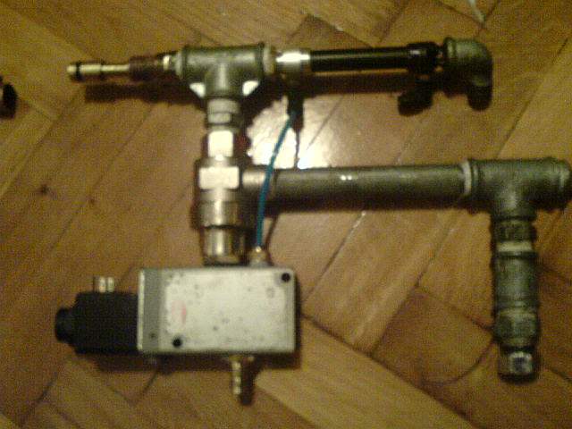 that brass thing is the bolt - it's normally in forward positon (in the pic) when I activate the valve QEV fires and air is sent to the air cylinder, which retracts the bolt... a marble falls down and as I depress the button it's sent forward into the barrel and the bolt closes off ammo port (copper T)