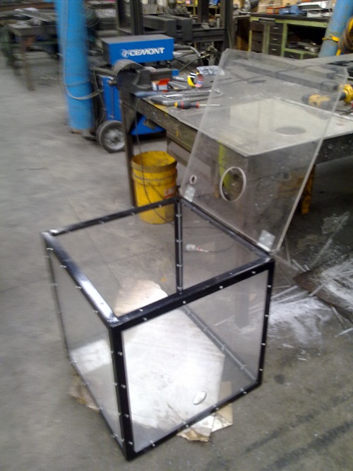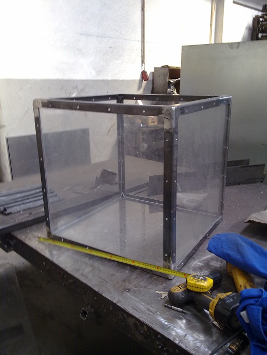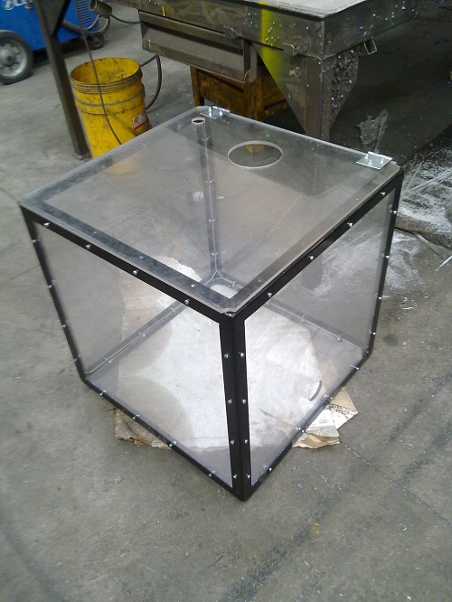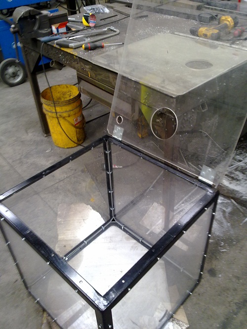 Also - merely screwing the polycarbonate onto the outsides such as you have done will create huge stress risers (effectively making them frangible panels!) and you won't reap many of the benefits of the material you are using! Instead you should run a strip of material such as aluminum flat stock/bar stock which is the same width as the framing underneath it to spread out the load. On that strip - drill holes the same spacing you currently have and put the screws through the backing material, then the polycarbonate then into the frame. Just a suggestion - you can make your device however you like!