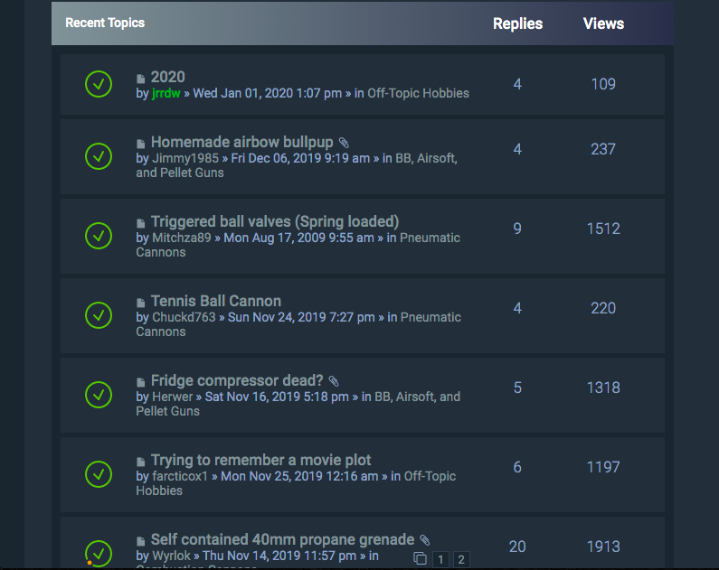 On both forums I can see the thread title, location, age, original poster, number of views and posts, and whether there are new posts for me. At least I assume I can see the latter here, thats what the big green tick means, right?
