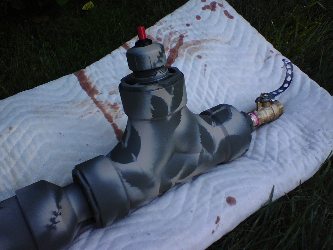 Three weeks ago I had never seen a potato gun. Two weeks ago I made my first gun. This weekend I made my second gun. This gun is simular to my first design. This too rockets potatos very far with the first click of the Weber igniter. It has a 3" chamber "T" and a 1.5" barrel but this one is longer at 36". It also has a slight reverse bevel so your "ammo" has a nice tight fit every time. What makes this gun special is the attention to the details. The barrel "guard" took forever to make the right way, but was well worth it. The upgraded 3/4" bronze ball valve with custom handle is a nice touch as is the front "sight", but its the killer paint job that makes this gun. Krylon "Fusion" type paint for plastic is the way to go. Even my wife, who is less than thrilled that I spent all day Saturday making my second potato gun in two weeks, was impressed. Thats good enough for me. Good spudding