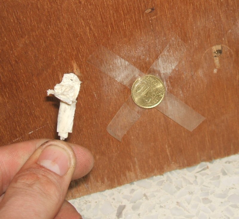 Following on from this thread, I thought I'd see if my 6mm burst disc project was up to the challenge. Target was a 10 Euro coin (I hear the dollar is weak against the Euro right now, so it must be tougher than a quarter ;p) and ammunition was a 40mm long masonry nail wrapped in tape to fit the barrel. The video and pics speak for themselves