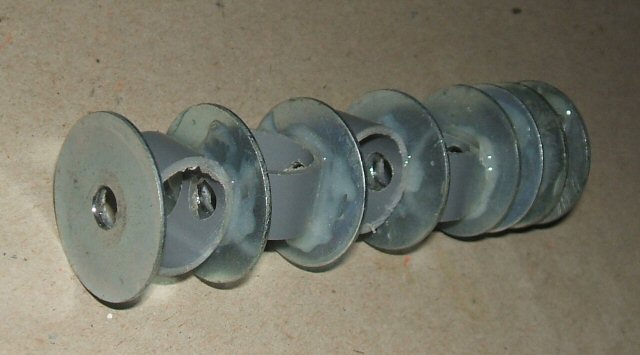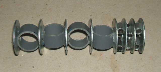 The baffle array is first assembled using various spacers, with the washers on a steel rod to ensure correct alignment, and secured with quick setting epoxy. The assembly is then wrapped in duct tape and then secured in the main tube with epoxy, fixing the washers in place and adding extra srength to the PVC tube. The muzzle end is then sealed off, providing a large final expansion chamber with an 8mm hole at the exit.