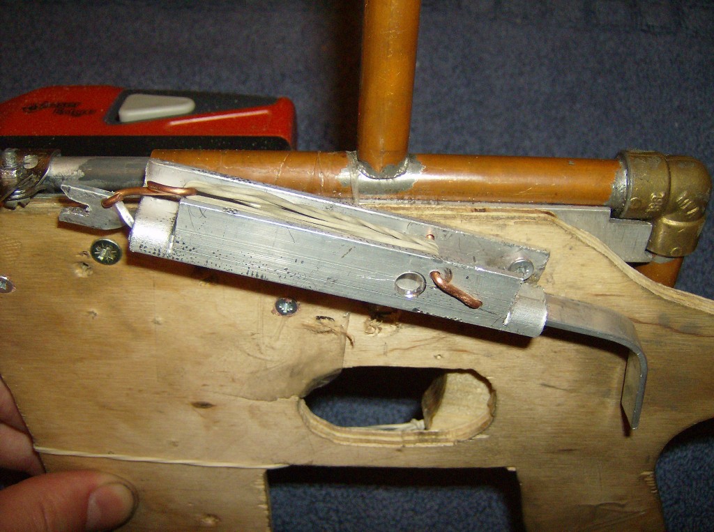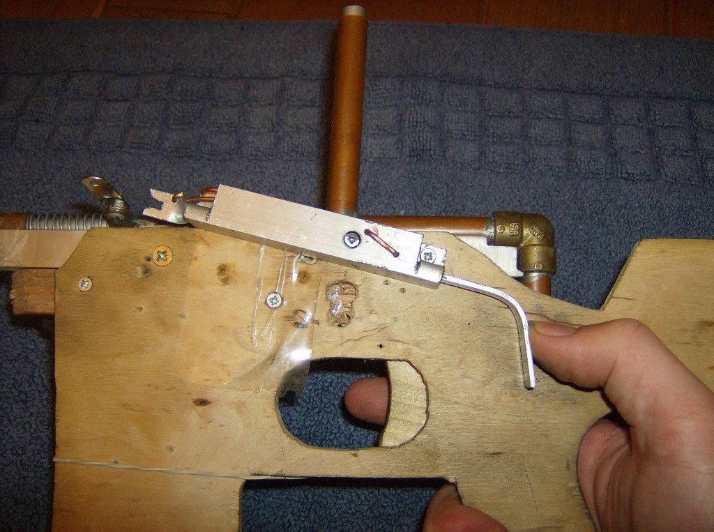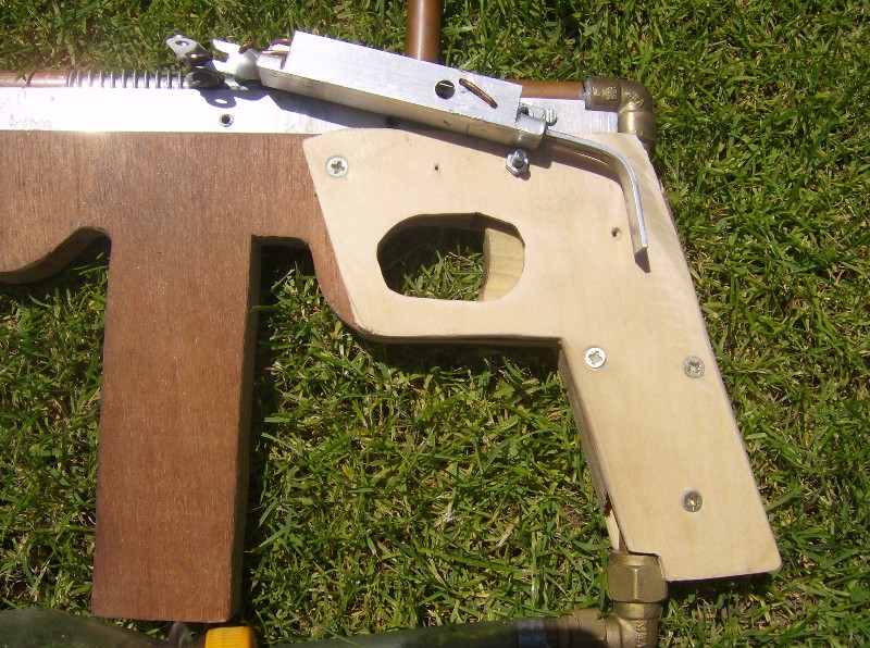 This homemade gun shoots 0.12gram bb balls at around 280miles/h. (450km/h) It works on a 1.5 liter coke bottle at 5bar operating pressure. It can shoot about 40 times on this bottle. It also has a gravity fed magazine. I also have a system to make sure that the balls dont roll out of the barrel and that there are no double feeds. At the moment I am working on a automatic airsoft gun which recocks on the pressure of the bottle as well; just like an uzi. So inother words this gun still needs to be recocked manually.