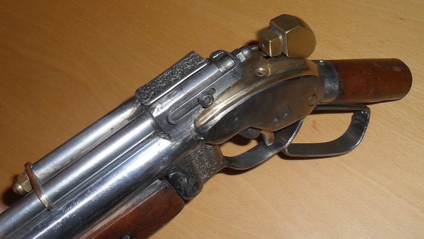 Aesthetically though, I think you're going for the literal "sawn off" look where a lever action rifle was literally cut down. In order to achieve this look, I think making the handle actually look like a dismembered grip from a full stock would be the most important addition