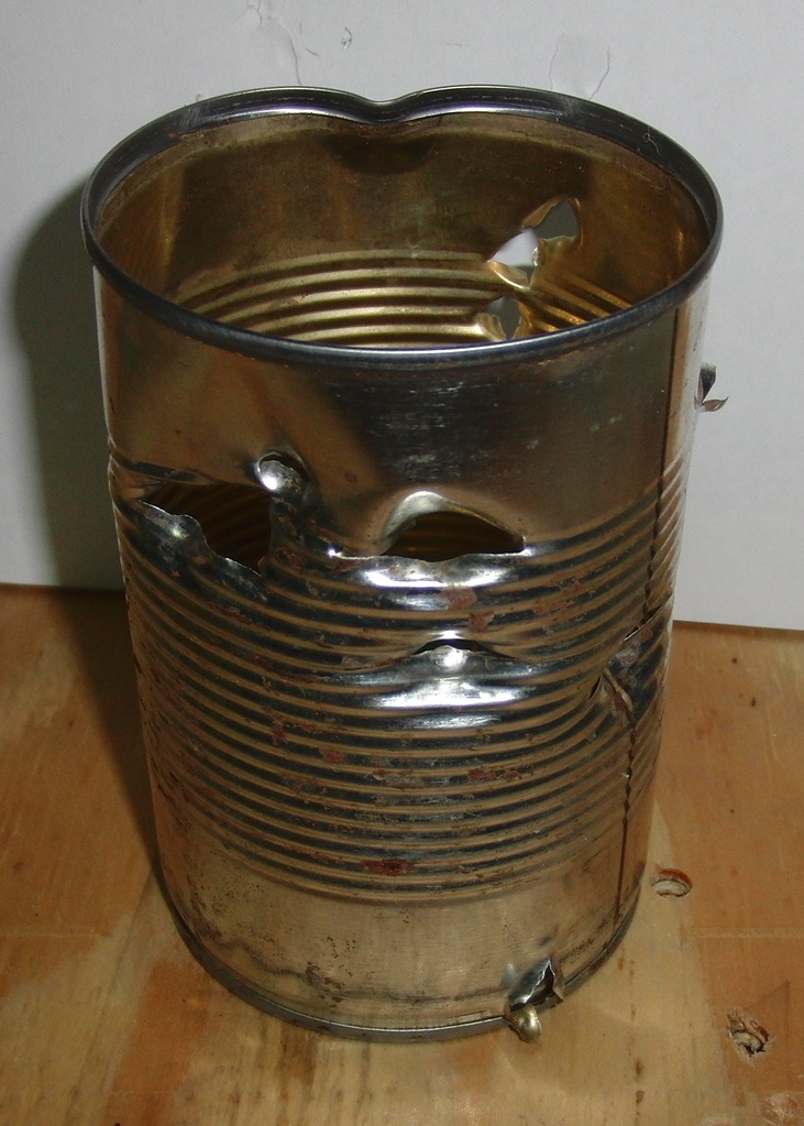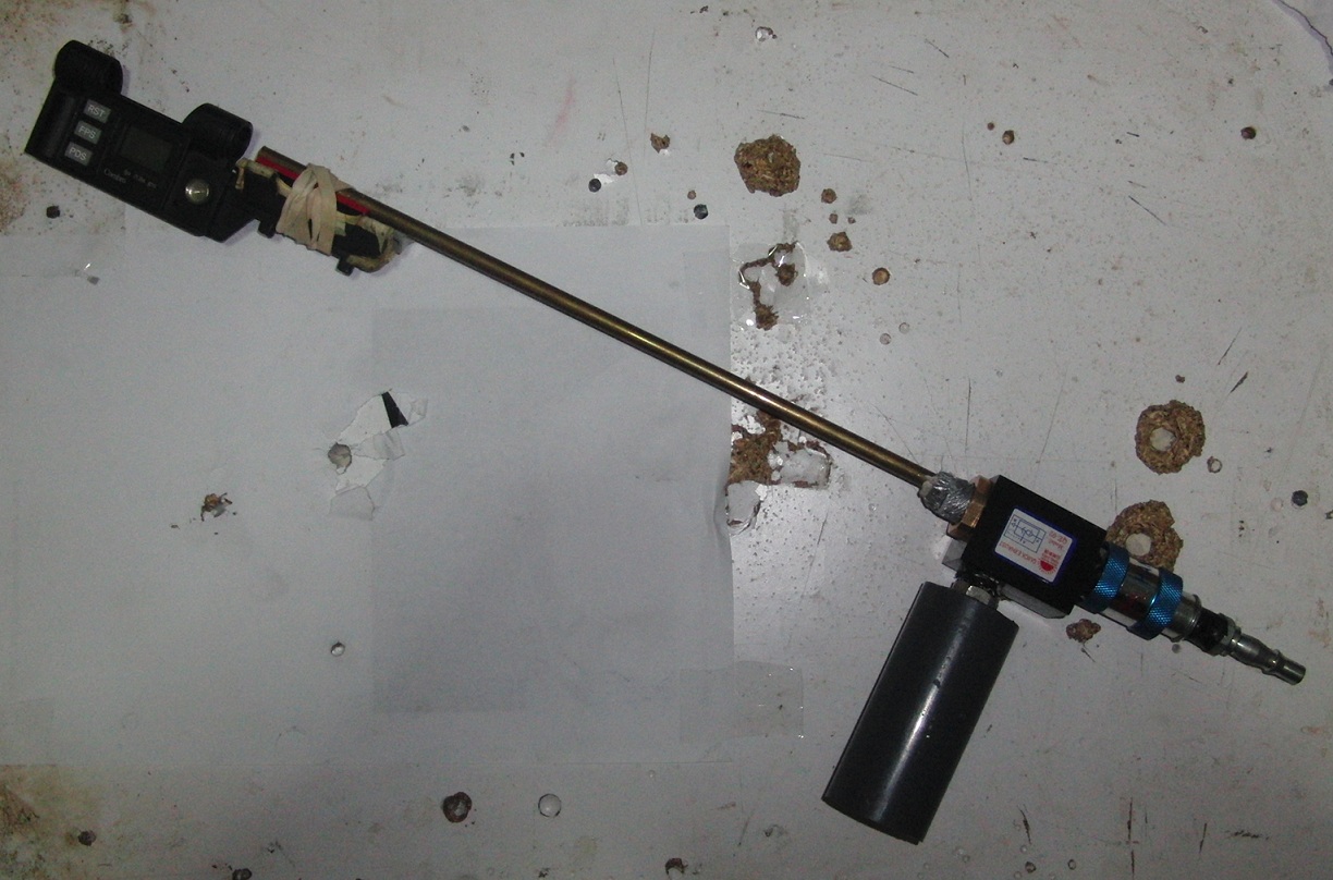 Some photos, my test setup with Combro CB-625 chrony at the end of the barrel, and a mangled soup tin.