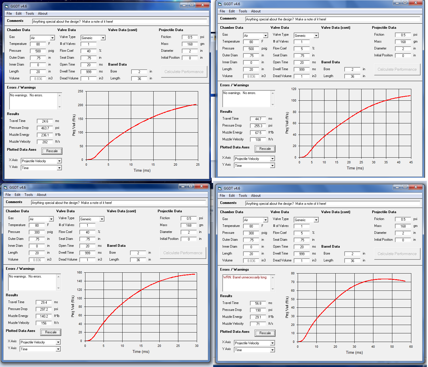 Could you post screenshots, there might be a parameter you're/we're missing.High-PSI wrote:The muzzle velocity goes up with a smaller diameter barrel that is longer (but the same volume). The velocity goes WAY up. Is tha because the air has a straighter shot into the valve?
