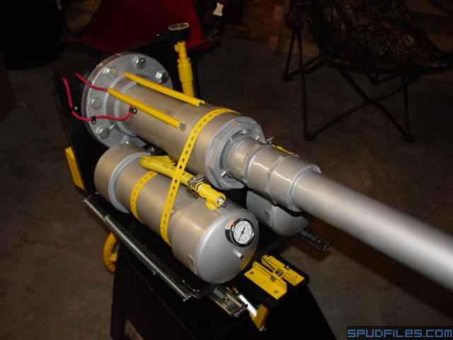 First, that gun is not metal, it is painted pvc (correct me if i'm wrong), and the chambers hold the air to fire the cannon with. A very slick gun though.