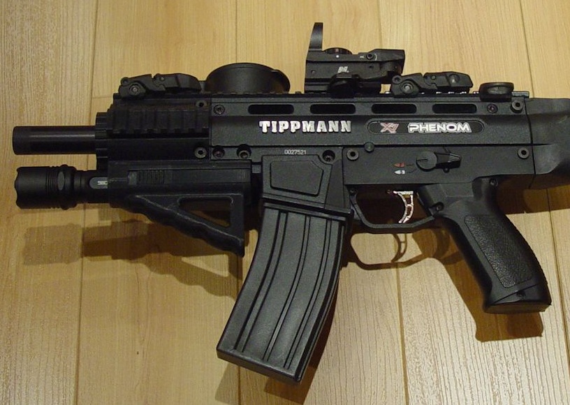 1) a foregrip with rails and flashlight holder for a Phenom paintball marker which LeMaudit designed from scratch using solidworks, made up of multiple interlocking parts