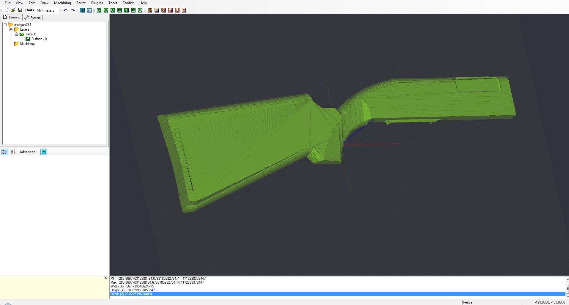The main issue is getting a suitable 3D model. The one below was taken from a Google Sketchup model of (allegedly) a Remington 700, then exported as an STL format file for CAM processing. Each surface generates about 80,000 lines of code for the CNC mill to chew on. I can produce something to about 0.1mm accuracy, that's about 4 thou for you non-metric types, the result really depends on the tooling and the material.