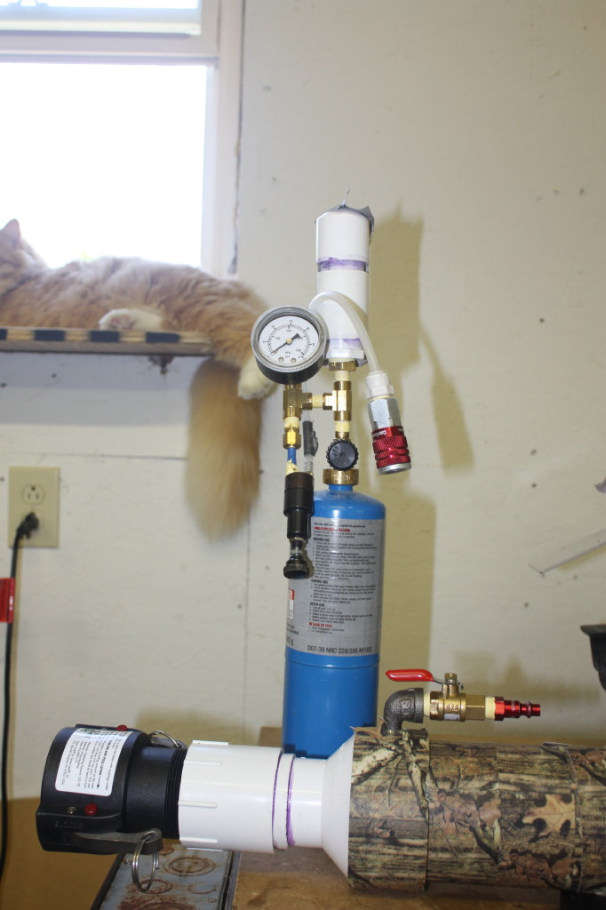 The cannon uses a propane metering system connected with an air tool quick release coupler. Much lighter to handle that way - it already looks pretty goofy with the 10 foot barrel attached.