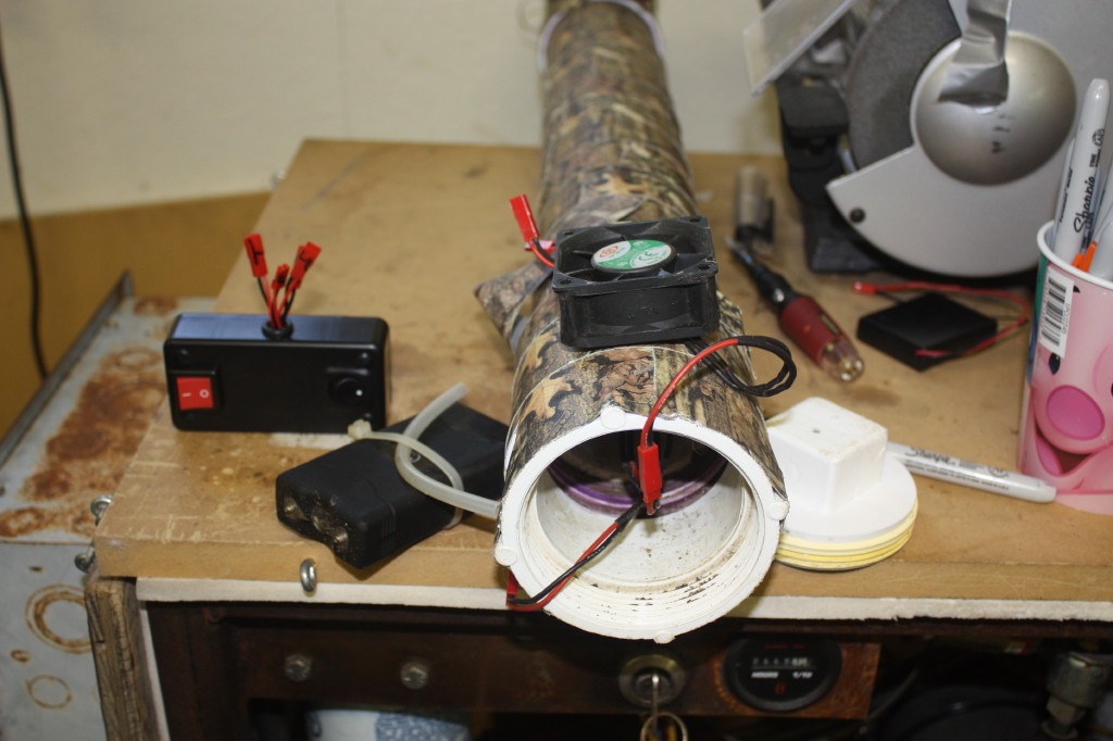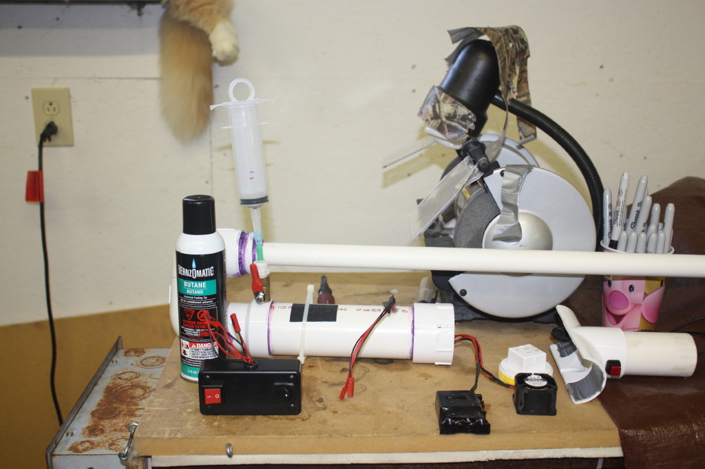 Today's project is sawing off the top to get the spark gap, placing the spark gap inside the 1.5 inch chamber and using the rest of the case as the handle, providing me a trigger, safety switch, and power for the 5 volt chamber fan. Neat, clean and small!
