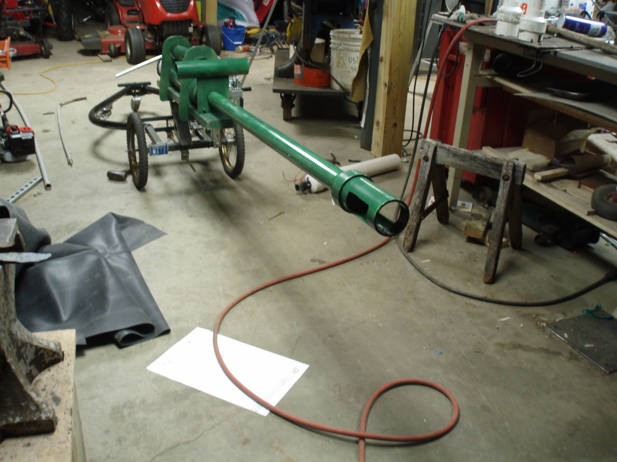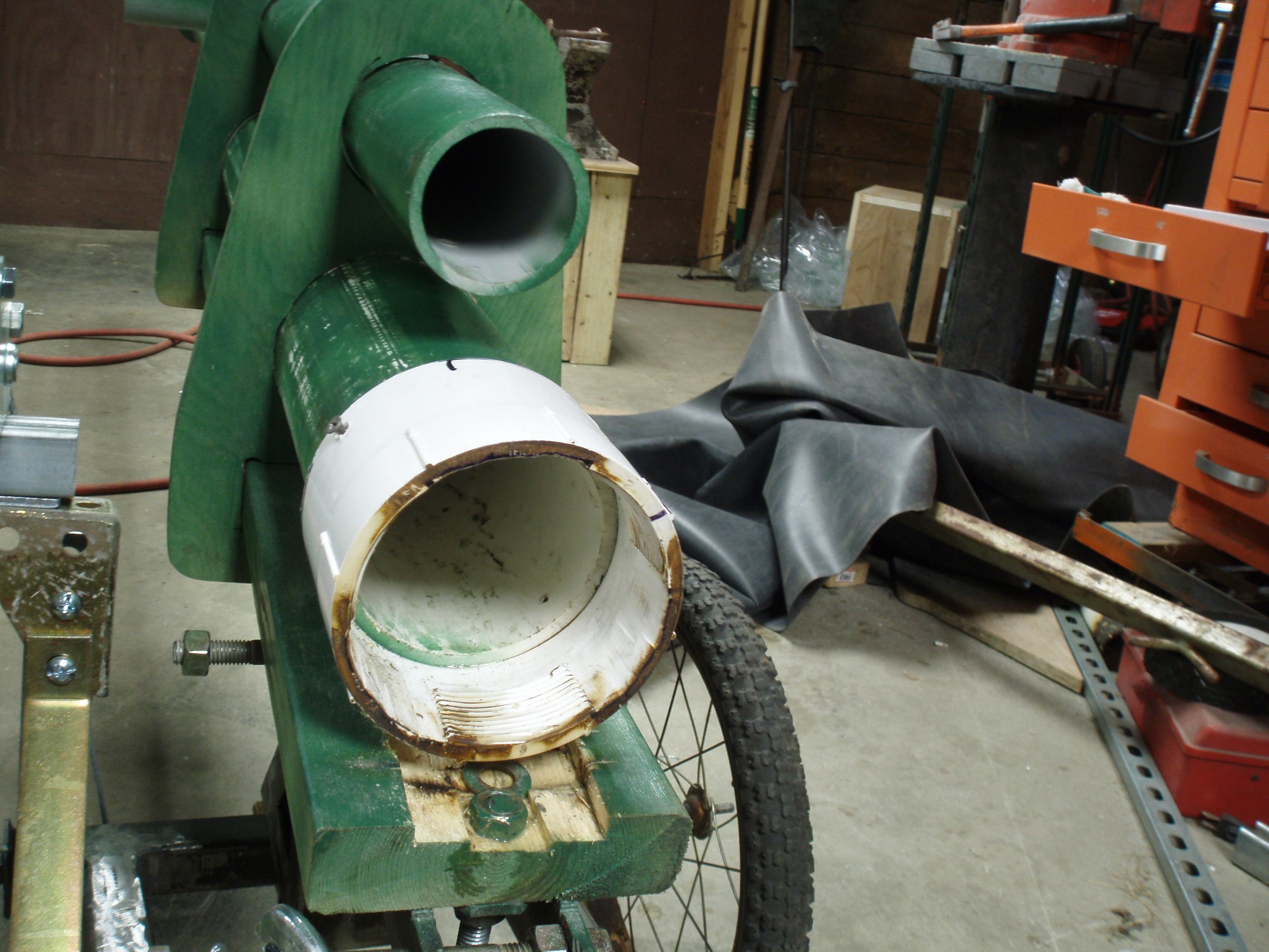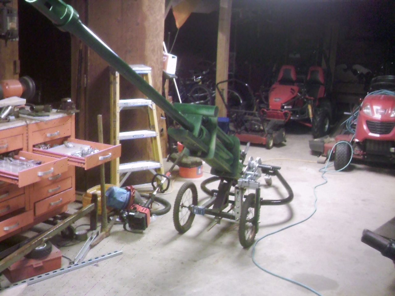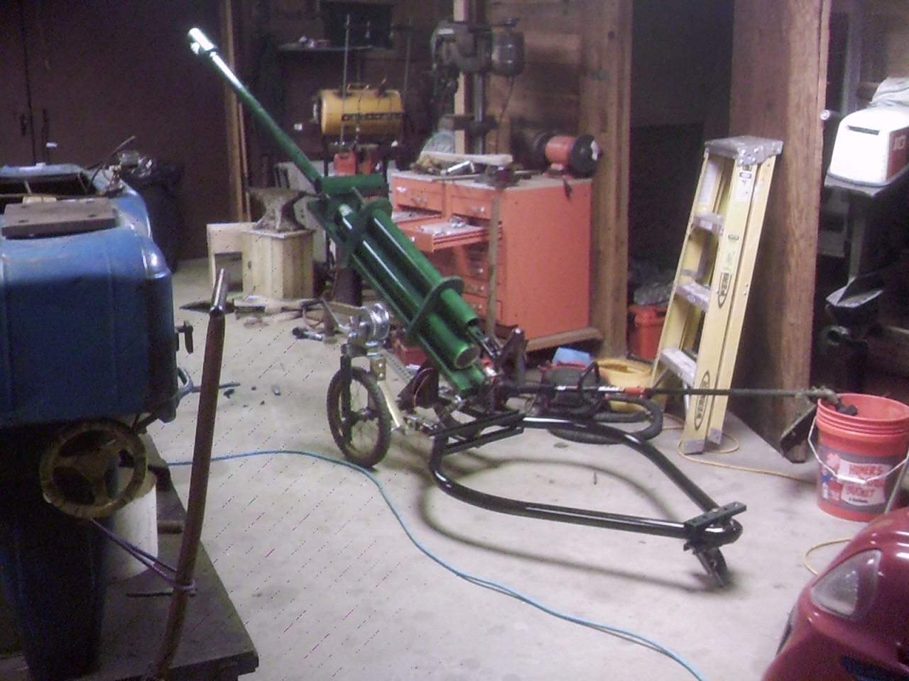My original carriage fell apart, and I threw out the frame because I had to keep the chamber, barrel, and two shells in my dorm room for a few months. Brought it home thinking I could get it to work the way I intended. Welded a heavy duty frame up, tore apart an old bicycle for parts, and made it look cool. The shell thing... no dice. I couldn't get them to ignite using spark plugs.