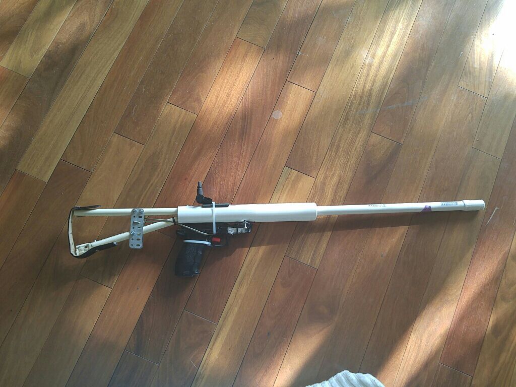 Progress has been made. I finished the cannon this afternoon. Its ready for its first shots. I have an 18 inch barrel of 1/2 inch PVC and a 6 inch 3/4 inner dia. combustion chamber sparked by Char-broil brand BBQ igniter. All of this concealed in a 1 1/4 inch PVC upper receiver and a lower receiver taken from broken Walmart H&K P30 Airsoft pistol. The barrel is threaded onto the chamber because with the stock in place there is no way to access the combustion chamber.