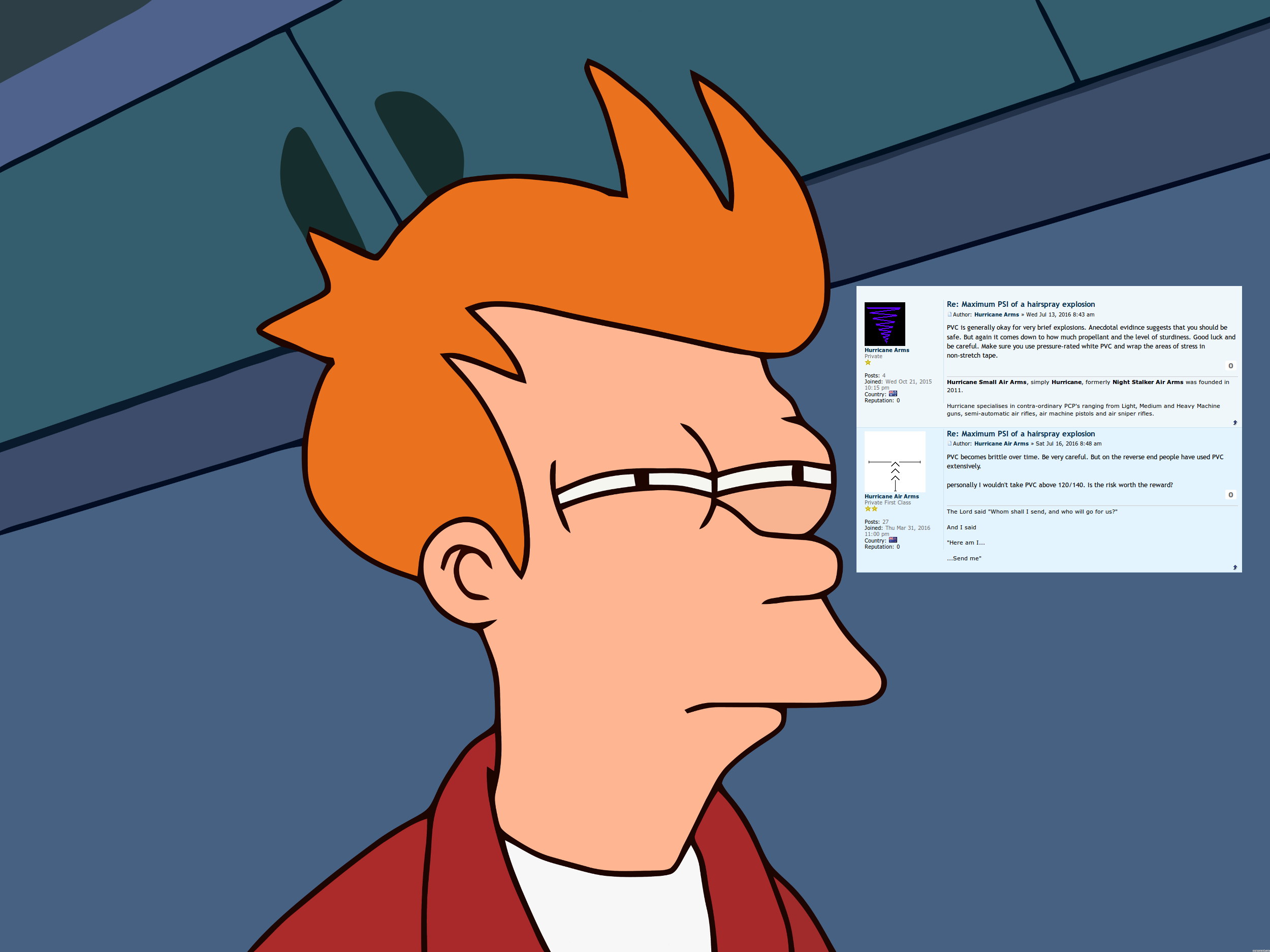 And, when considering safety you have to do a worse case scenario. In general, hairspray sucks as fuel since it can't be accurately measured. But, for a safety analysis you have to assume that you hit the absolutely perfect fuel amount (which you'll rarely actually will). Still, hair spray is propane or butane and the theoretical combustion pressure is only about 140 PSIG, and that only occurs when the fuel ratio is exactly correct and you have a closed chamber (or your ammo is jammed in the barrel and can't move).